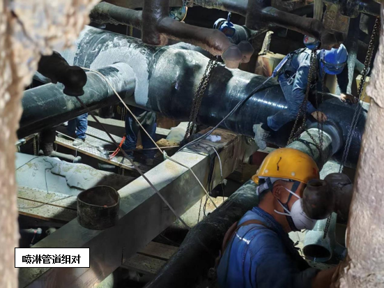 維修方案確定后,攀藍鼎立即開始著手噴淋管道采購預制工作,考慮到目前燒結產能不飽和,系統(tǒng)多處停機的因素,決定預制管道到廠后由檢修進行拆除及更換,只保留技術性要求較高的玻鋼粘接由專業(yè)施工人員來完成。7月24日,在材料到廠后,檢修立即開始在塔內布置安全措施,并進行噴淋層打拆工作,打拆過程中檢修對切下的三通支管進行仔細甄別,磨損嚴重的進行報廢處理,還具備使用價值的作為備件歸置,以確保物盡其用。打拆完畢后,檢修隨即進行管道吊裝及內部組裝配管工作,配管完成后防腐單位開始進場作業(yè),在此過程中檢修全程安排人員進行組對及工程質量監(jiān)督工作,并及時撤場收尾。